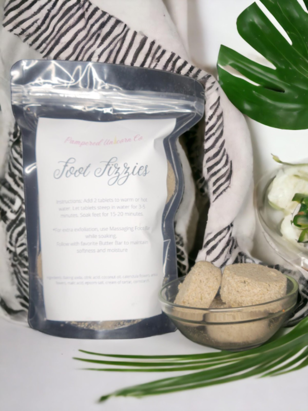 Simply drop 2 foot fizzies into a large bowl filled with warm water and let it dissolve, then soak your feet for 15-20 minutes. The Epsom salt, malic acid, arnica, calendula and essential oils will help to soften and soothe your feet, while the baking soda will help to neutralize odors. Each pack contains 5 uses.